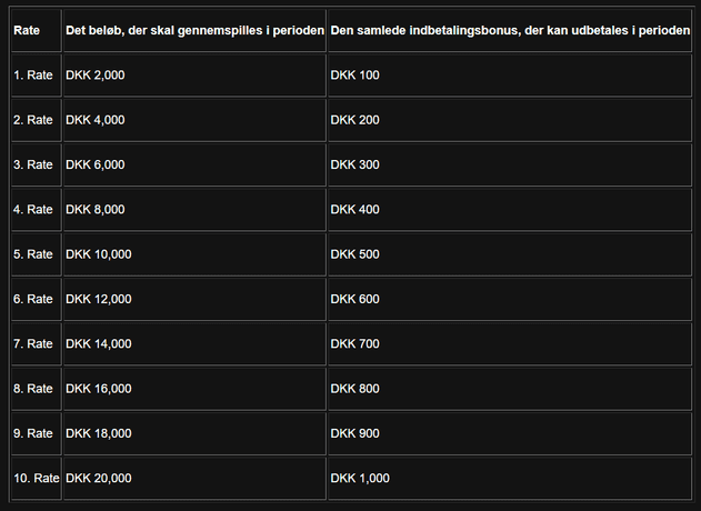 Kun nye spillere. Gennemspilskrav: 10x. Minimumsindsats: 1 kr. Minimumsindbetaling: 100 kr. Progressive jackpot-spil undtagen. 30 dage til at aktivere, og 60 dage til at bruge. Maksimal Bonus: 1000 kr. +18. Spil ansvarligt. Stopspillet: Hjælpelinje til ansvarligt spil: (+45) 70222825. Selv-udelukkelse: www.ROFUS.nu. Fulde vilka og betingelser gælder.